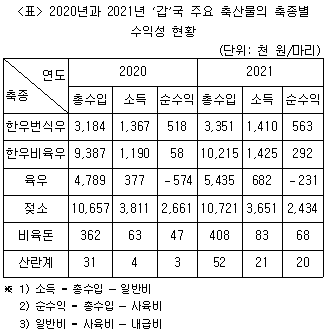다음 <표>는 2020년과 2021년 '갑'국 주요 축산물의 축종별 수익성 현황에 관한 자료이다. 이에 대한 설명으로 옳은 것은?