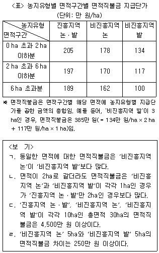 다음 <표>는 '갑'국의 면적직불금 지급단가에 관한 자료이다. 이에 대한 <보기>의 설명 중 옳은 것만을 모두 고르면?