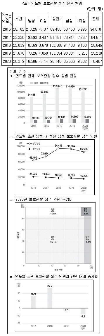 다음 <표>는 '갑'국의 2016~2020년 보호관찰 접수 인원에 관한 자료이다. <표>를 이용하여 작성한 <보기>의 자료 중 옳은 것만을 모두 고르면?