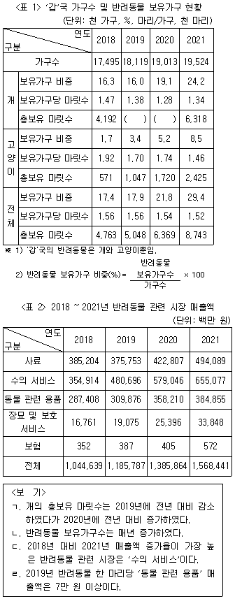 다음 <표>는 2018~2021년 '갑'국의 가구수 및 반려동물 보유가구 현황과 관련 시장 매출액에 관한 자료이다. 이에 대한 <보기>의 설명 중 옳은 것만을 모두 고르면?