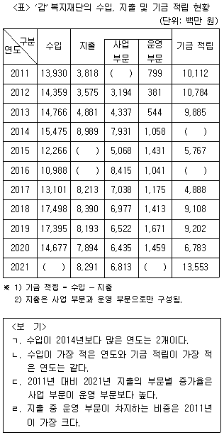 다음 <표>는 2011~2021년 '갑'복지재단의 수입, 지출 및 기금 적립 현황에 관한 자료이다. 이에 대한 <보기>의 설명 중 옳은 것만을 모두 고르면?
