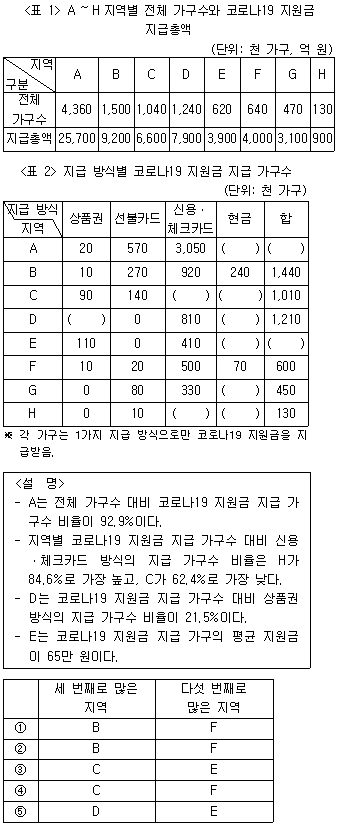 다음 <표>와 <설명>은 2020년 '갑'국 A~H지역의 코로나19 지원금에 관한 자료이다. 이에 근거하여 A~H지역 중 현금 방식의 지급 가구수가 세 번째로 많은 지역과 다섯 번째로 많은 지역을 바르게 연결한 것은?