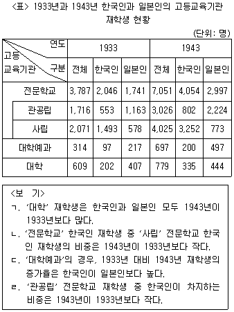다음 <표>는 일제강점기 1933년과 1943년 한국인과 일본인의 고등교육기관 재학생 현황에 관한 자료이다. 이에 대한 <보기>의 설명 중 옳은 것만을 모두 고르면?