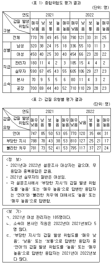 다음 <표>와 <정보>는 2021년과 2022년 A기업의 전체 직원 1,000명을 대상으로 갑질 발생 위험도를 설문조사한 결과이다. 이를 근거로 한 <보기>의 설명 중 옳은 것만을 모두 고르면?