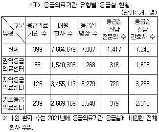 다음 <표>는 2021년 12월 31일 기준 '갑'국 응급의료기관의 응급실 현황에 관한 자료이다. 이에 대한 설명으로 옳은 것은?