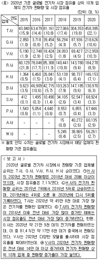 다음 <표>는 2020년 기준 글로벌 전기차 시장 점유율 상위 10개 업체의 2015~2020년 전기차 판매량에 관한 자료이다. 이에 대한 <보고서>의 설명 중 옳은 것만을 모두 고르면?