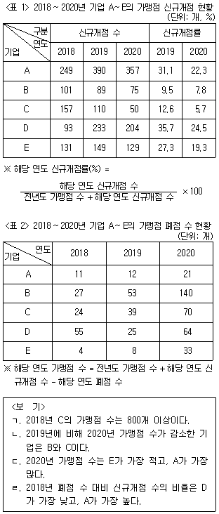 다음 <표>는 2018~2020년 프랜차이즈 기업 A~E의 가맹점 현황에 관한 자료이다. 이에 대한 <보기>의 설명 중 옳은 것만을 모두 고르면?