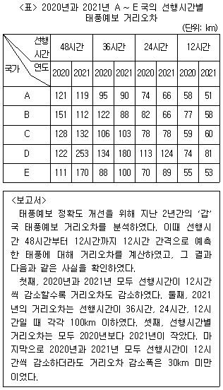 다음 <표>는 2020년과 2021년 A∼E국의 선행시간별 태풍예보 거리오차에 관한 자료이고, <보고서>는 '갑'국의 태풍예보 거리오차를 분석한 자료이다. 이를 근거로 판단할 때, A~E 중 '갑'국에 해당하는 국가는?