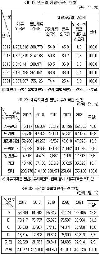 다음 <표>는 2017~2021년 '갑'국의 불법체류외국인 현황에 관한 자료이다. 이에 대한 설명으로 옳은 것은?