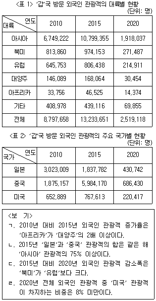 다음 <표>는 '갑'국을 방문한 외국인 관광객을 관광객 국적에 따라 대륙별, 국가별로 정리한 자료이다. 이에 대한 <보기>의 설명 중 옳은 것만을 모두 고르면?