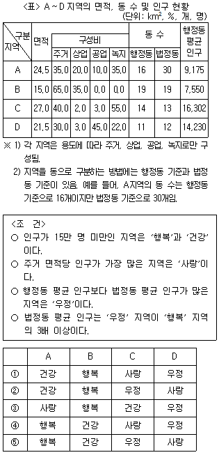 다음 <표>는 A~D지역의 면적, 동 수 및 인구 현황에 관한 자료이다. <표>와 <조건>을 근거로 A~D에 해당하는 지역을 바르게 나열한 것은?