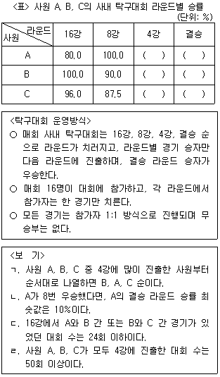 다음 <표>는 총 100회 개최된 사내 탁구대회에 매회 모두 참가한 사원 A, B, C의 라운드별 승률에 관한 자료이다. <표>와 <탁구대회 운영방식>에 근거한 <보기>의 설명 중 옳은 것만을 모두 고르면?