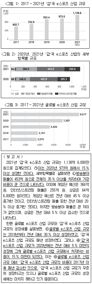 다음 <그림>은 '갑'국 및 글로벌 e스포츠 산업 규모에 관한 자료이다. 이에 대한 <보고서>의 내용 중 옳지 않은 것은?