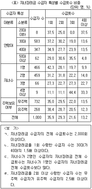 다음 <표>는 2021년 A시 자녀장려금 수급자의 특성별 수급횟수를 조사한 자료이다. 이에 대한 <보기>의 설명 중 옳은 것만을 모두 고르면?