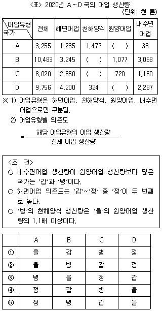 다음 <표>는 2020년 A~D국의 어업 생산량에 관한 자료이다. <표>와 <조건>을 근거로 A~D에 해당하는 국가를 바르게 나열한 것은?