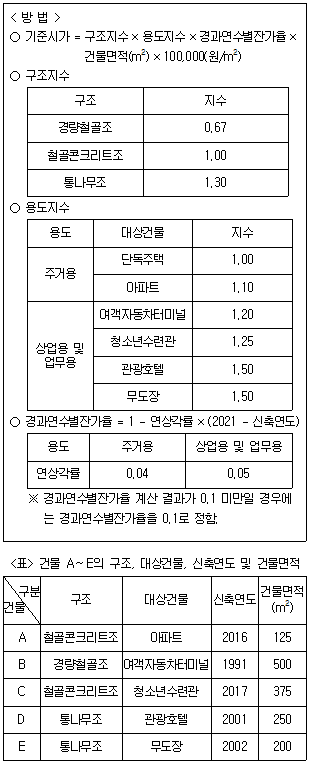 다음 <방법>은 2021년 '갑'국의 건물 기준시가 산정방법이고, <표>는 건물 A~E의 기준시가를 산정하기 위한 자료이다. 이에 근거하여 A~E 중 2021년 기준시가가 두 번째로 높은 건물을 고르면?