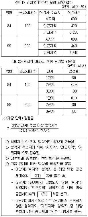 다음 <표>는 A지역 아파트 분양 청약 및 경쟁률에 관한 자료이다. <표>와 <청약 및 추첨 방식>을 근거로 판단할 때, (가)에 해당하는 값은?