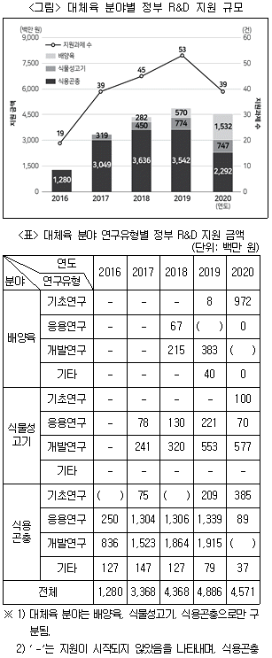다음 <그림>과 <표>는 2016~2020년 '갑'국 대체육 분야의 정부 R&D 지원 규모에 관한 자료이다. 이에 대한 설명으로 옳은 것은?
