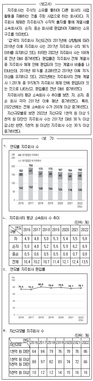 다음 <보고서>는 2016~2022년 '갑'국의 지주회사 및 소속회사에 관한 자료이다. <보기>의 자료 중 <보고서>의 내용에 부합하는 것만을 모두 고르면?