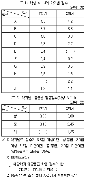 다음 <표>는 2022년 '갑'대학 학생 A~J의 학기별 봉사 점수에 관한 자료이다. 이에 대한 설명으로 옳은 것은?