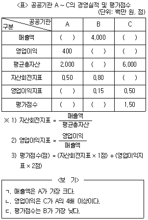다음 <표>는 '갑'국 공공기관 A∼C의 경영실적 및 평가점수에 관한 자료이다. 이에 대한 <보기>의 설명 중 옳은 것만을 모두 고르면?