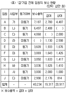 다음 <표>는 2023년 '갑'기업 전체 임원(A~J)의 보수 현황에 관한 자료이다. 이에 대한 설명으로 옳은 것은?