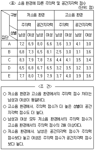 다음 <표>는 소음 환경에 따른 A~E집단의 주의력 및 공간지각력 점수에 관한 자료이다. 이를 근거로 A~E 중 <조건>을 모두 만족하는 집단을 고르면?