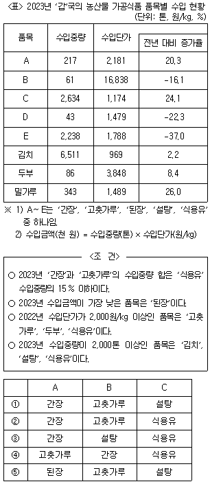 다음 <표>는 2023년 '갑'국의 농산물 가공식품 품목별 수입 현황에 관한 자료이다. <표>와 <조건>에 근거하여 A~C에 해당하는 농산물 가공식품을 바르게 연결한 것은?