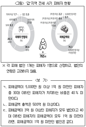다음 <그림>은 '갑'지역 전세 사기 피해자 765명의 피해자 연령대별, 피해금액대별 현황에 관한 자료이다. 이에 대한 <보기>의 설명 중 옳은 것만을 모두 고르면?