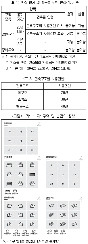 다음 <표>는 '갑'국의 빈집 철거 및 활용을 위한 빈집정비기준이고, <그림>은 '갑'국의 '가'~'자' 구역 및 빈집의 정보에 관한 자료이다. 이에 대한 설명으로 옳은 것은?