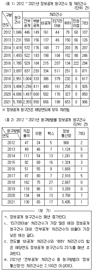 다음 <표>는 2012~2021년 우리나라 D부처 정보공개 청구에 관한 자료이다. 이에 대한 <보기>의 설명 중 옳은 것만을 모두 고르면?