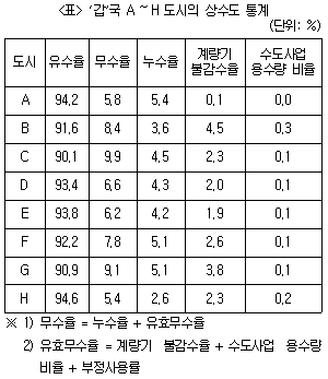 다음 <표>는 2023년 '갑'국 8개 도시(A~H)의 상수도 관련 자료이다. 이에 대한 설명으로 옳지 않은 것은?