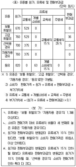 다음 <표>는 '갑'국의 유종별 소비자 판매가격 산정에 관한 자료이다. 이에 대한 <보기>의 설명 중 옳은 것만을 모두 고르면?