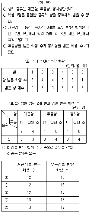 다음 <정보>와 <표>는 '갑'초등학교 6학년 1~6반 학생이 받은 상에 관한 자료이다. 이를 근거로 개근상을 받은 학생 수와 우등상을 받은 학생 수를 바르게 연결한 것은?
