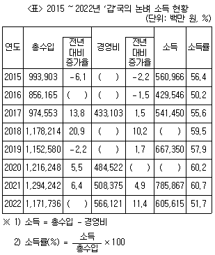 다음 <표>는 2015~2022년 '갑'국의 논벼 소득에 관한 자료이다. 이에 대한 설명으로 옳은 것은?