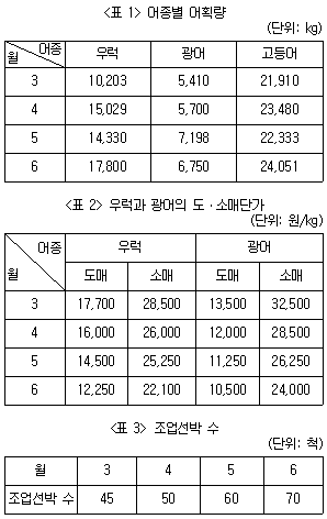 다음 <표>는 2022년 3~6월 '갑'국 연안에서의 3개 어종 어업 현황에 관한 자료이다. 이에 대한 설명으로 옳은 것은?