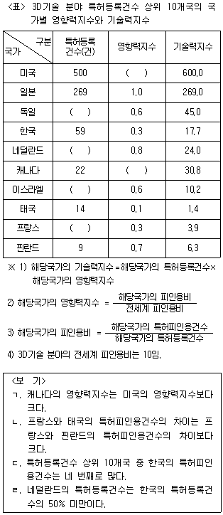 다음 <표>는 3D기술 분야 특허등록건수 상위 10개국의 국가별 영향력지수와 기술력지수를 나타낸 자료이다. 이에 대한 <보기>의 설명 중 옳은 것만을 모두 고르면?