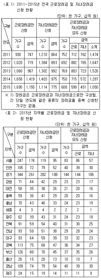 다음 <표>는 우리나라 근로장려금과 자녀장려금 신청 현황에 관한 자료이다. 이에 대한 설명으로 옳지 않은 것은?