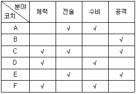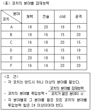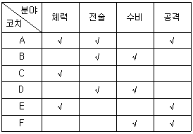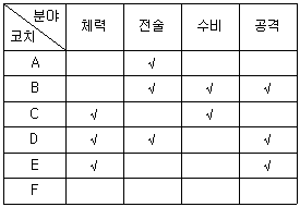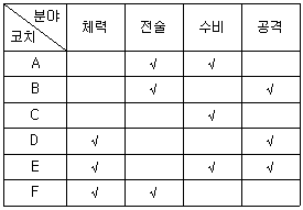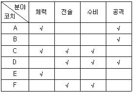 다음 <표>는 '갑'국 축구 국가대표팀 코치(A~F)의 분야별 잠재능력을 수치화한 것이다. 각 코치가 맡은 모든 분야를 체크(√)로 표시할 때, <표>와 <조건>에 부합하는 코치의 역할 배분으로 가능한 것은?