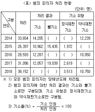 다음 <표>는 2014~2018년 '갑'국의 범죄 피의자 처리 현황에 대한 자료이다. 이에 대한 설명으로 옳은 것은?