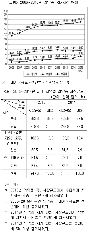 다음 <그림>과 <표>는 연도별 의약품 국내시장 현황과 세계 지역별 의약품 시장규모에 관한 자료이다. 이에 대한 <보기>의 설명 중 옳은 것만을 모두 고르면?