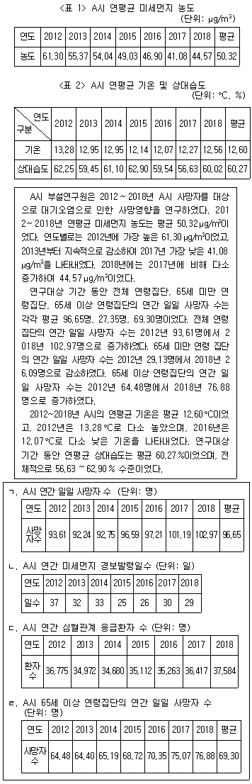 다음 <표>와 <보고서>는 A시 대기오염과 그 영향에 관한 자료이다. 제시된 <표> 이외에 <보고서>를 작성하기 위해 추가로 필요한 자료만을 <보기>에서 모두 고르면?