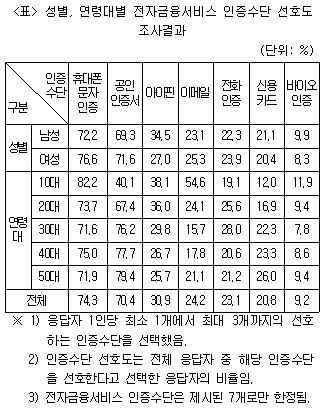 다음 <표>는 성별, 연령대별 전자금융서비스 인증수단 선호도에 관한 자료이다. 이에 대한 설명으로 옳지 않은 것은?