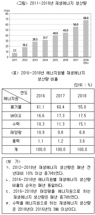 다음 <그림>과 <표>는 '갑'국의 재생에너지 생산 현황에 관한 자료이다. 이에 대한 <보기>의 설명 중 옳은 것만을 모두 고르면?
