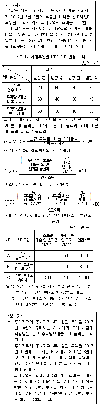 다음 <보고서>와 <표>는 '갑'국의 부동산 투기 억제 정책과 세대유형별 주택담보대출에 관한 자료이다. 이에 대한 <보기>의 내용 중 옳은 것만을 모두 고르면?