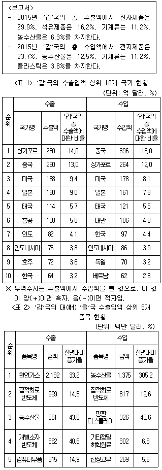 다음 <보고서>와 <표>는 2015년 '갑'국의 수출입 현황에 대한 자료이다. 이에 대한 설명으로 옳지 않은 것은?
