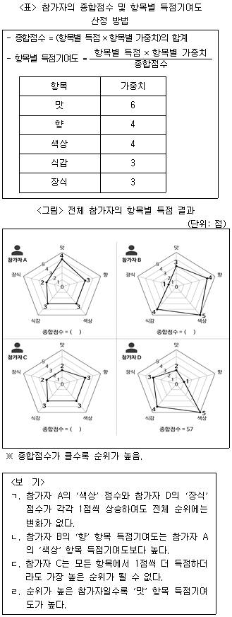 다음 <표>와 <그림>은 '갑'요리대회 참가자의 종합점수 및 항목별 득점기여도 산정 방법과 항목별 득점 결과이다. 이에 대한 <보기>의 설명 중 옳은 것만을 모두 고르면?