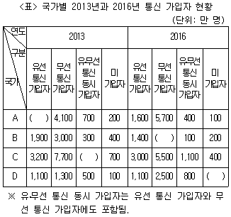 다음 <표>는 2013년과 2016년에 A~D 국가 전체 인구를 대상으로 통신 가입자 현황을 조사한 자료이다. 이에 대한 설명으로 옳은 것은?
