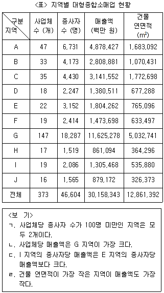 다음 <표>는 '갑'국 A∼J 지역의 대형종합소매업 현황에 대한 자료이다. 이에 대한 <보기>의 설명 중 옳은 것만을 모두 고르면?