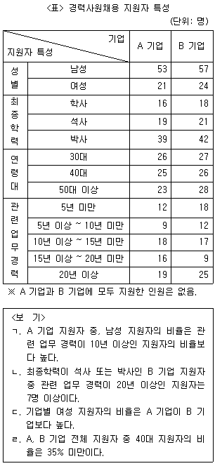 다음 <표>는 A, B 기업의 경력사원채용 지원자 특성에 관한 자료이다. 이에 대한 <보기>의 설명 중 옳은 것만을 모두 고르면?
